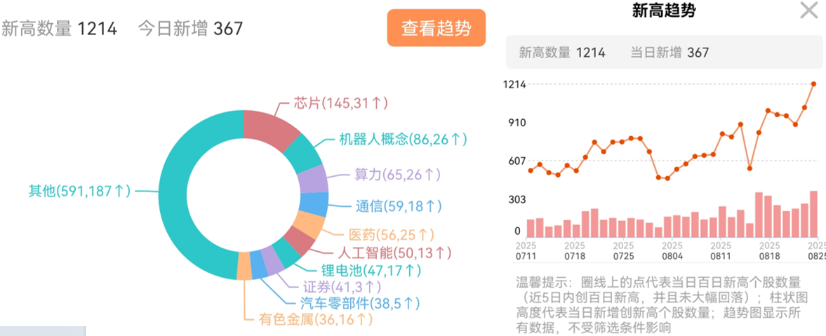 从百日新高,判断板块轮动节奏还是比较准的,百日新高数据继续新高,市场情绪很好!目前是在芯片(自主可控)>机器人>算力>通信,目前依旧是芯片全面占据第一位