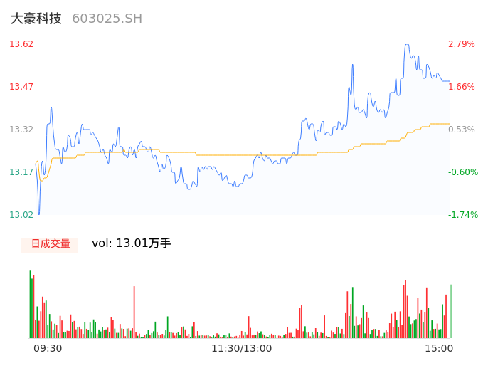 04月23日,大豪科技收报13.44,股价涨幅1.43%,成交金额1.74亿元,换手率1.17%。