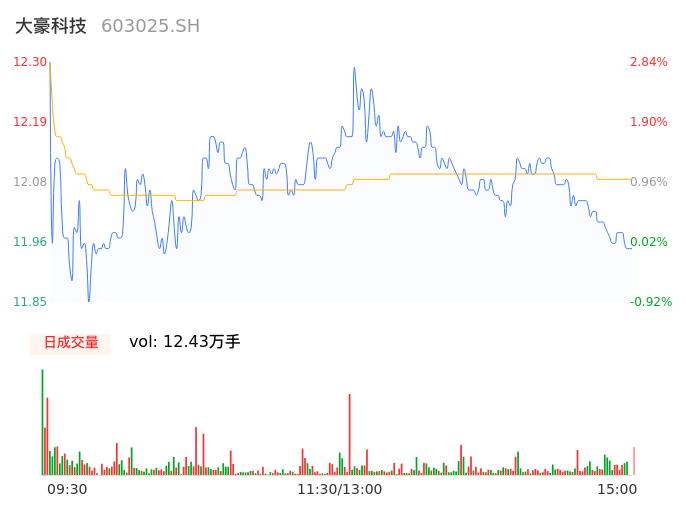 04月18日,大豪科技收报11.95,股价涨幅-0.08%,成交金额1.50亿元,换手率1.12%。