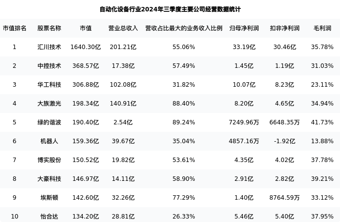 大豪科技最新报告期数据为三季度,下表汇总了自动化设备行业内市值靠前的公司三季度主要经营数据