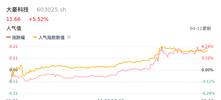 04月11日,大豪科技收报11.66,股价涨幅5.52%,成交金额1.99亿元,换手率1.58%。