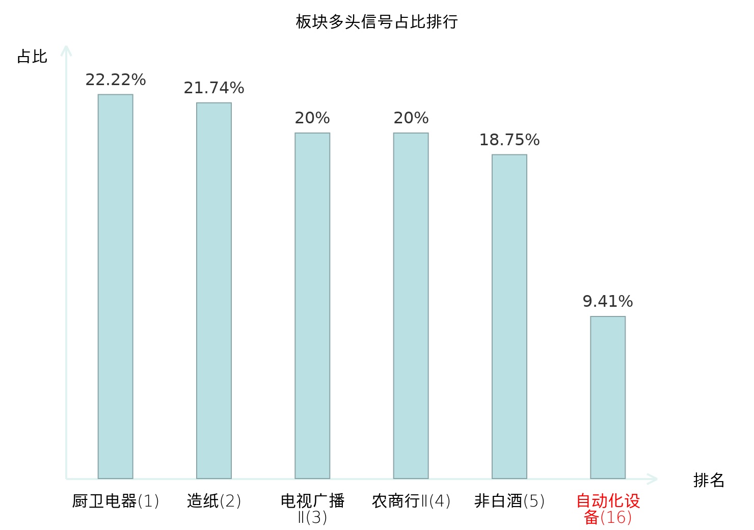 全市场所有行业板块中主力多头信号占比排名中,厨卫电器板块位居第一。厨卫电器板块名次提升最快,较昨日上升115位。