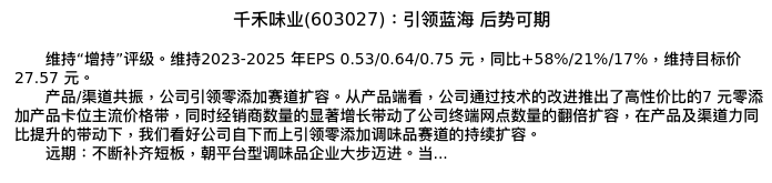 值得注意的是:2024年03月国泰君安的訾猛/徐洋分析师,首次发布关于千禾味业的研究报告,标题为:千禾味业(603027):引领蓝海 后势可期。