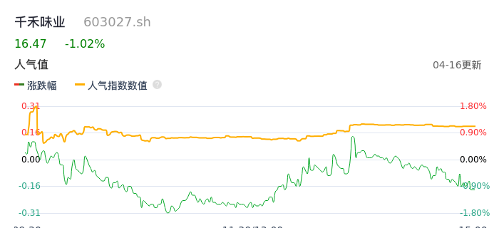 04月16日,千禾味业收报16.47,股价涨幅-1.02%,成交金额1.81亿元,换手率1.14%。