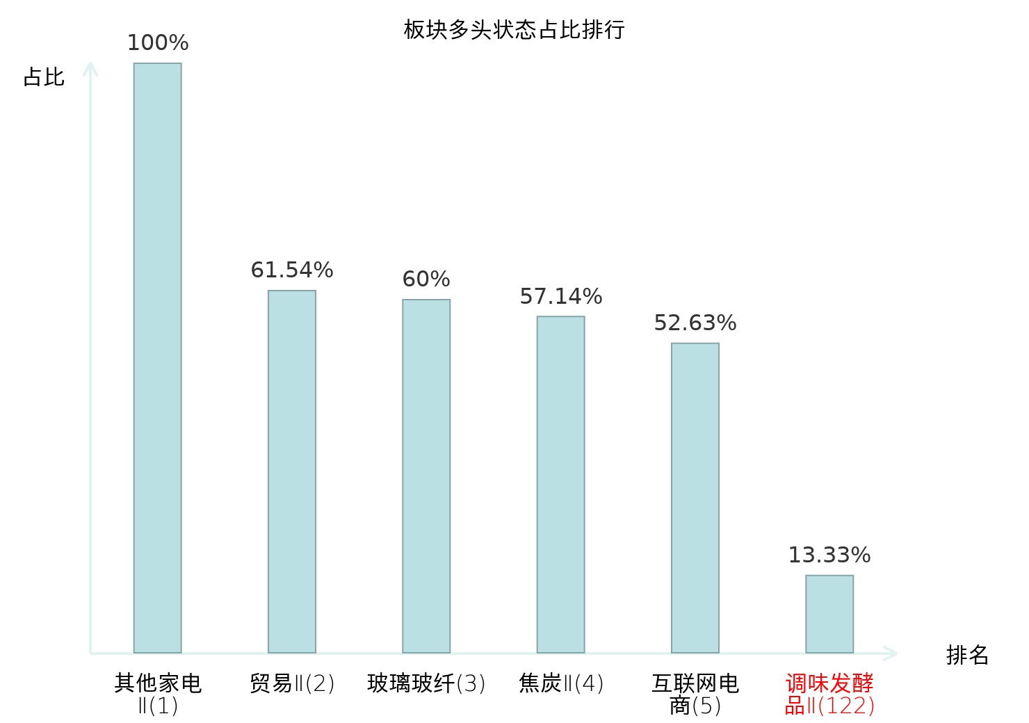 全市场所有行业板块中主力多头状态占比排名中,其他家电Ⅱ板块位居第一。教育板块名次提升最快,较昨日上升50位。