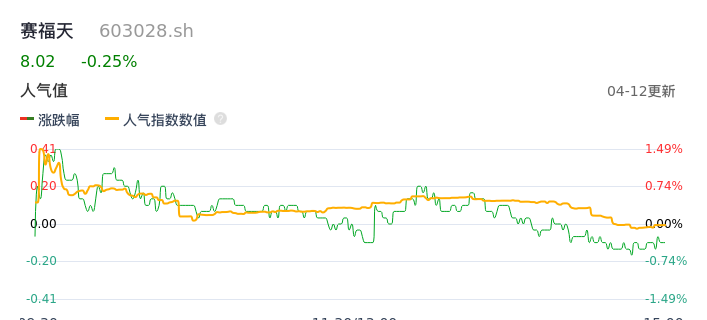 04月12日,赛福天收报8.02,股价涨幅-0.25%,成交金额2117.06万元,换手率0.92%。