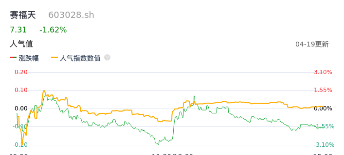 04月19日,赛福天收报7.31,股价涨幅-1.62%,成交金额3670.61万元,换手率1.73%。