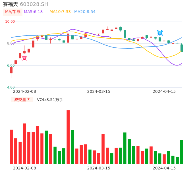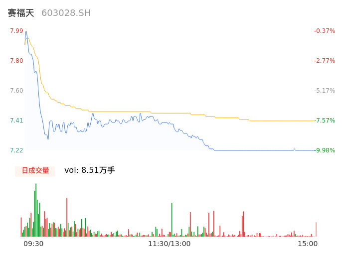 04月15日,赛福天收报7.22,股价涨幅-9.98%,成交金额6304.02万元,换手率2.97%。