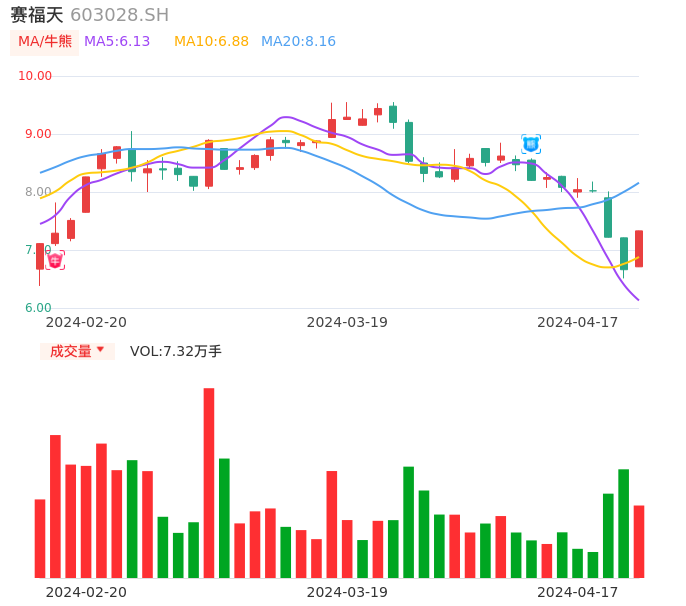 04月17日,赛福天收报7.33,股价涨幅10.06%,成交金额5205.36万元,换手率2.55%。