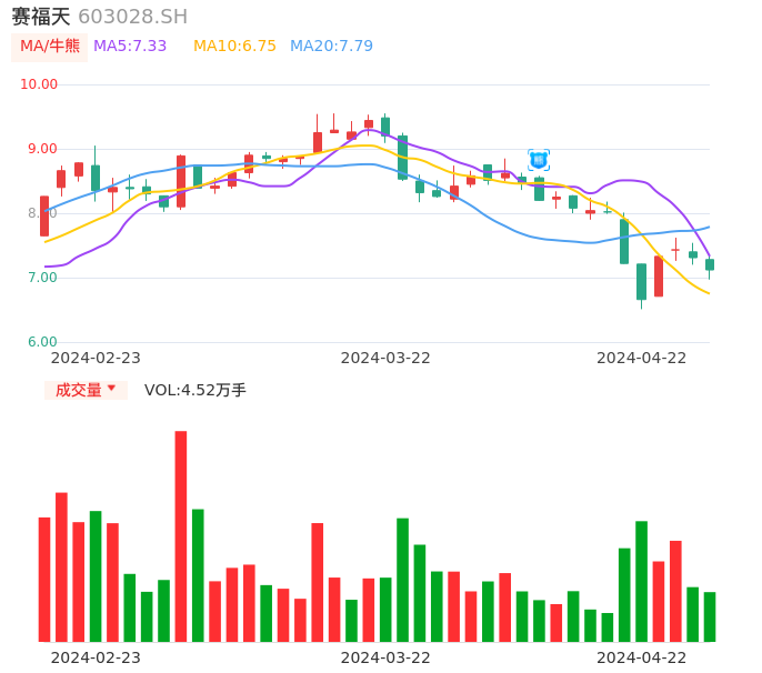 04月22日,赛福天收报7.12,股价涨幅-2.60%,成交金额3231.50万元,换手率1.58%。