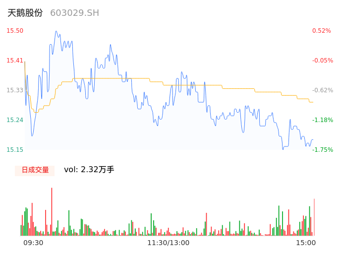 04月19日,天鹅股份收报15.20,股价涨幅-1.43%,成交金额3544.15万元,换手率1.91%。