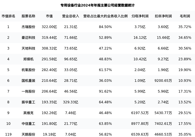 天鹅股份最新报告期数据为年报,下表汇总了专用设备行业内市值靠前的公司年报主要经营数据