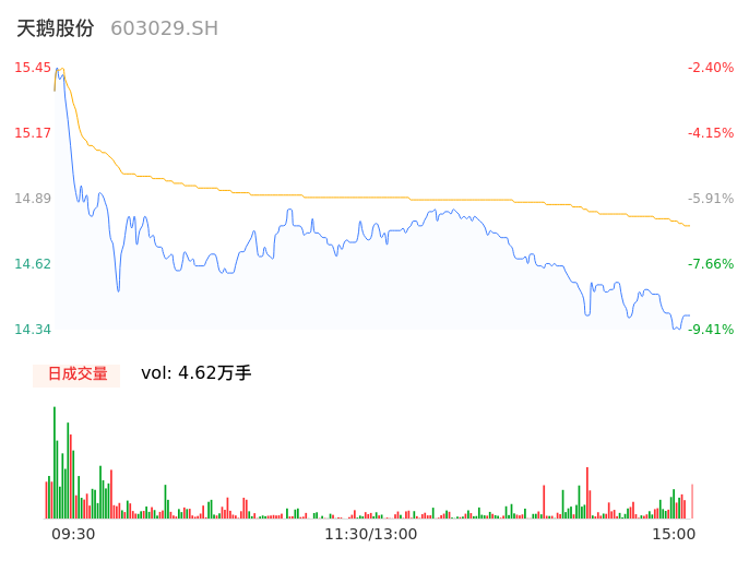 04月16日,天鹅股份收报14.40,股价涨幅-9.03%,成交金额6835.25万元,换手率3.81%。