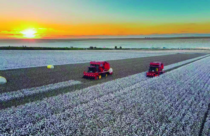 每年的10月至11月,新疆的棉花进入忙碌的收获期。晨光洒落新疆无垠棉田,六行自走式打包采棉机如钢铁天鹅般展翼起舞。这台国产装备以超94%的采净率谱写丰收乐章,单台工作量堪比千名拾花工。