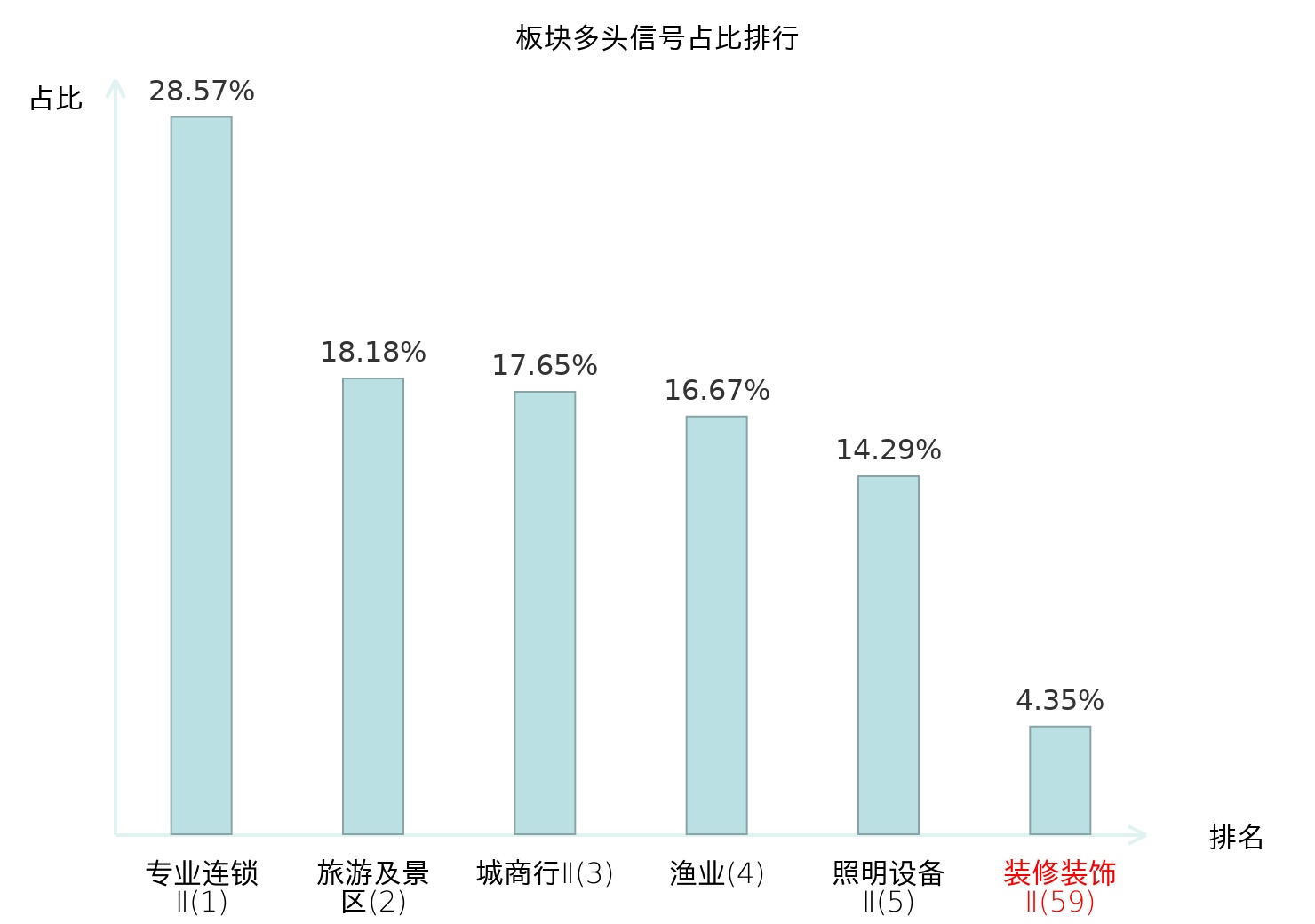 全市场所有行业板块中主力多头信号占比排名中,专业连锁Ⅱ板块位居第一。专业连锁Ⅱ板块名次提升最快,较昨日上升120位。