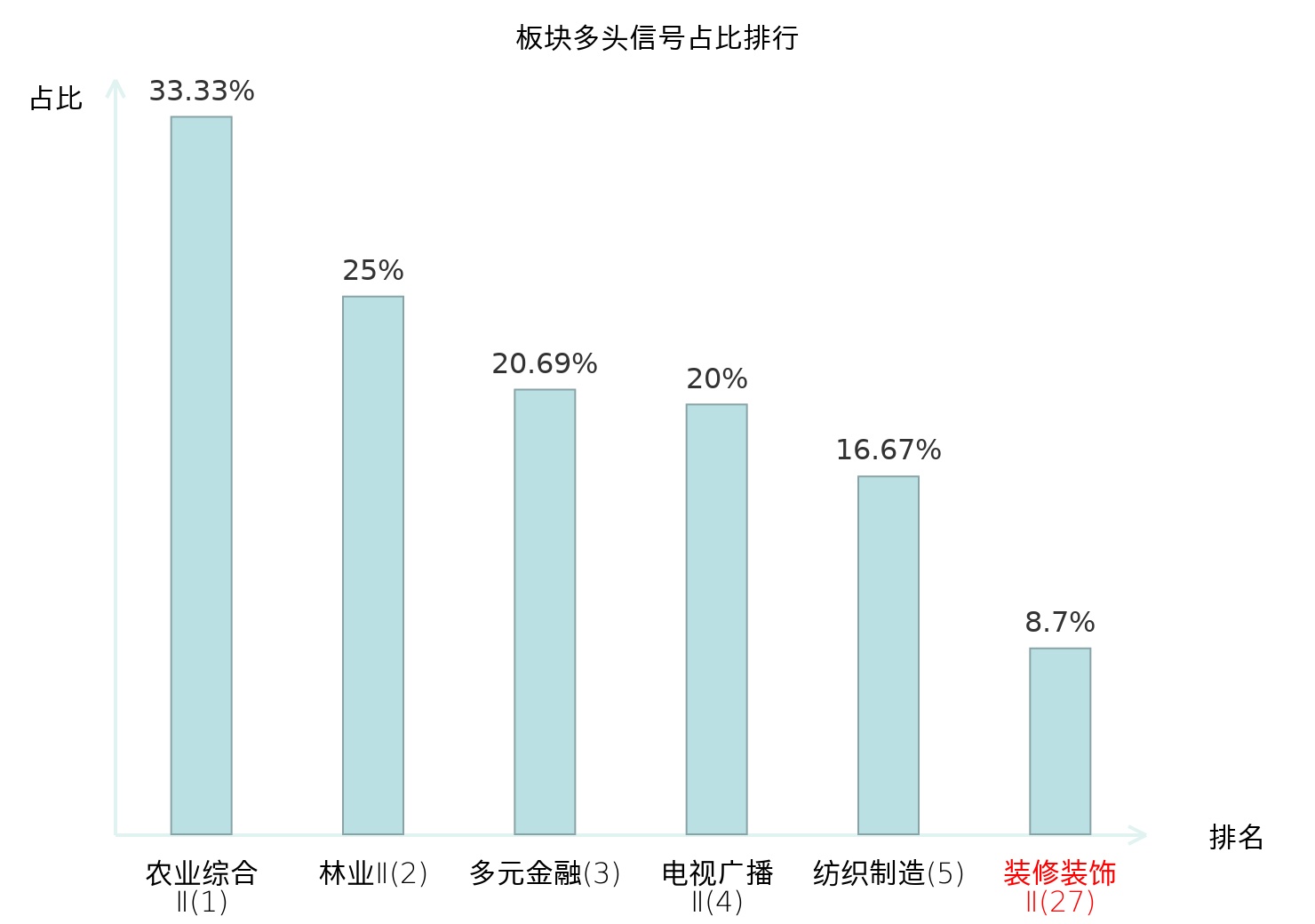 从主力宝信号数据分析,全筑股份所属的装修装饰Ⅱ板块中共2只股票发出主力多头信号,主力多头信号占比在全行业中排名第27位,较昨日上升59位。排名的提升表明主力对装修装饰Ⅱ板块的买入意愿增强,对投资者具有一定的参考价值。全市场所有行业板块中,农业综合Ⅱ板块的主力多头信号占比最高,位居第一;农业综合Ⅱ板块名次提升最快,较昨日上升127位。这些变动反映了主力资金在不同行业间的偏好调整,为投资者提供了关于市场趋势的重要信息。