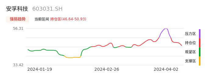 我们来看一下该股的九方特色指标强弱趋势的情况:安孚科技近日从压力区回到持仓区。股价快速拉升后出现持续调整。后续主要关注下方支撑位:46.64元是否能启稳回升。