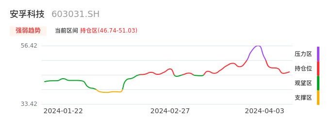 我们来看一下该股的九方特色指标强弱趋势的情况:安孚科技自03月29日从压力区回到持仓区。股价在持仓区盘整一段时间后,目前有启稳迹象。后续重点关注上方压力位:51.03元是否能重新上攻。