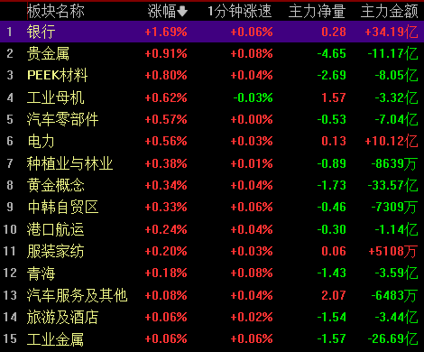 银行板块是今日唯一整体涨幅超过1%的板块,其他的方向大多也分化明显,