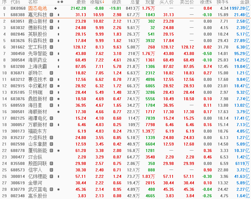 事件驱动:固态电池概念反复走强 ,德新科技走出3连板,赛伍技术涨停,上海洗霸涨超5%,续创历史新高,嘉元科技、海目星、英联股份等涨幅靠前。消息面上,近期固态电池资本运作密集。8月27日,华域汽车公告,公司拟以2.06亿元收购上汽集团持有的上海上汽清陶能源科技有限公司49%股权。8月29日晚,国轩高科公告,在芜湖市建设芜湖国轩20GWh新能源电池基地,业内认为或包括部分准固态电池量产线。