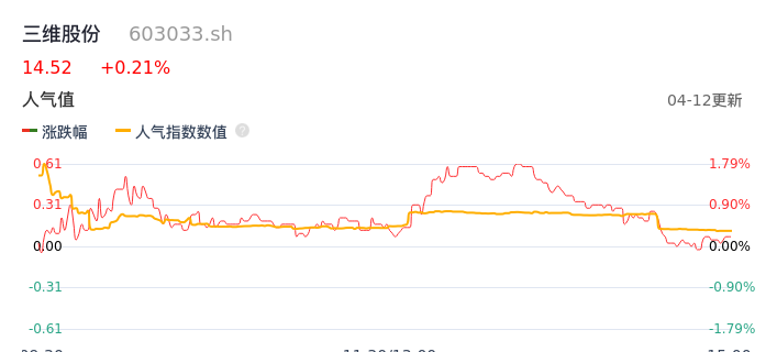 04月12日,三维股份收报14.52,股价涨幅0.21%,成交金额4151.73万元,换手率0.28%。