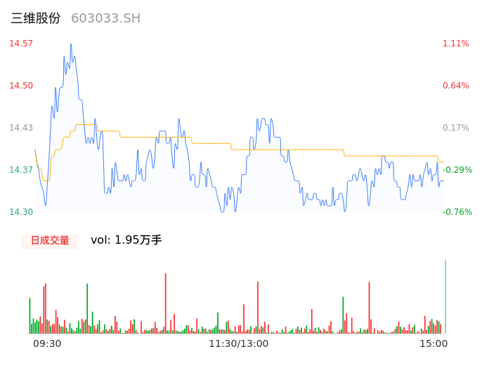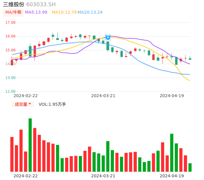 04月19日,三维股份收报14.31,股价涨幅-0.69%,成交金额2808.89万元,换手率0.19%。