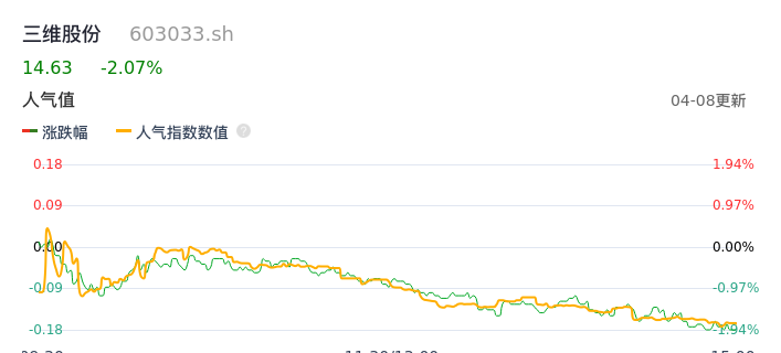 04月08日,三维股份收报14.63,股价涨幅-2.07%,成交金额3279.23万元,换手率0.22%。