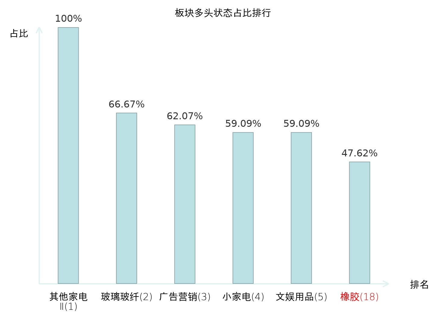 全市场所有行业板块中主力多头状态占比排名中,其他家电Ⅱ板块位居第一。消费电子板块名次提升最快,较昨日上升54位。