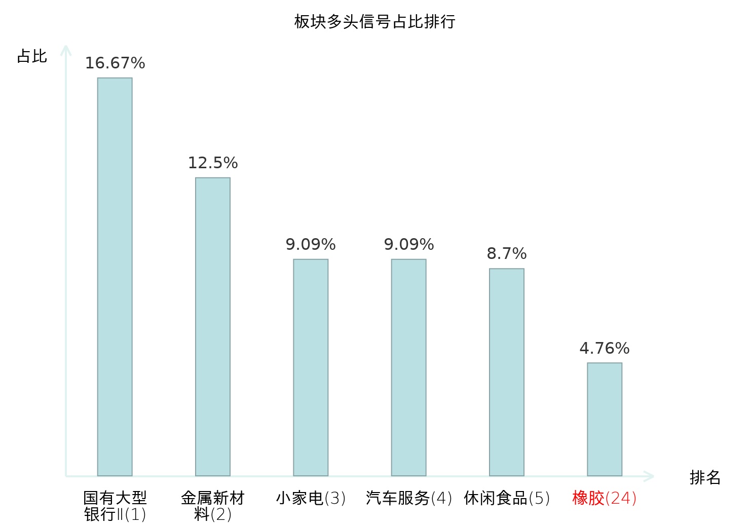 全市场所有行业板块中主力多头信号占比排名中,国有大型银行Ⅱ板块位居第一。汽车服务板块名次提升最快,较昨日上升109位。