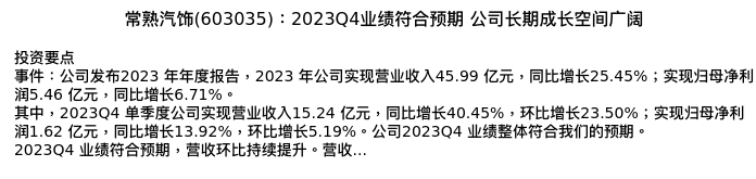 值得注意的是:2024年04月东吴证券的分析师,首次发布关于常熟汽饰的研究报告,标题为:常熟汽饰(603035):2023Q4业绩符合预期 公司长期成长空间广阔。