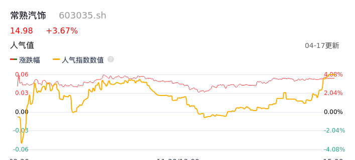 04月17日,常熟汽饰收报14.98,股价涨幅3.67%,成交金额1.30亿元,换手率2.29%。