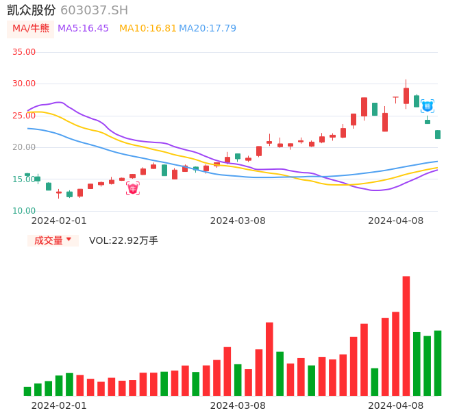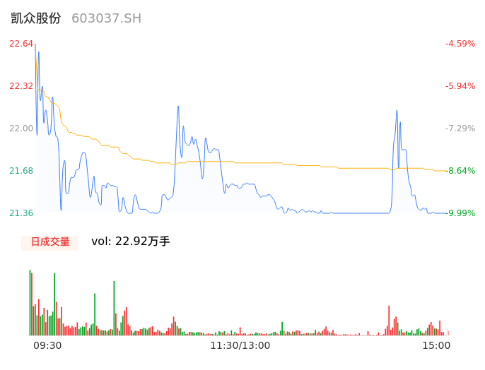 04月08日,凯众股份收报21.36,股价涨幅-9.99%,成交金额4.97亿元,换手率16.87%。