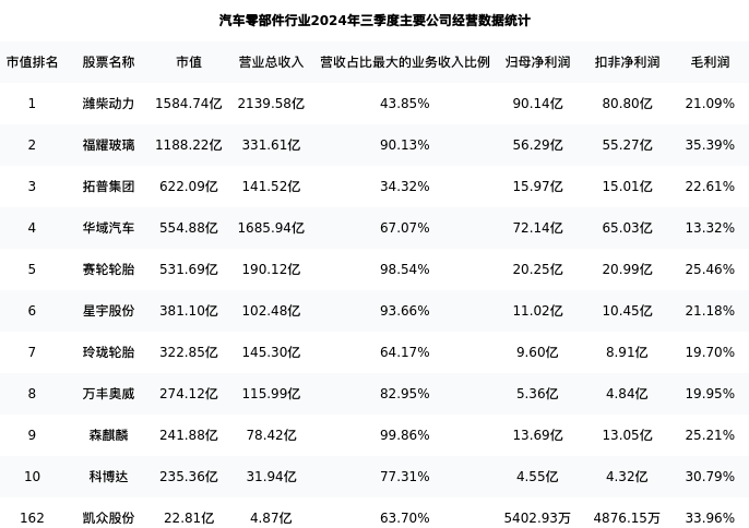 凯众股份最新报告期数据为三季度,下表汇总了汽车零部件行业内市值靠前的公司三季度主要经营数据