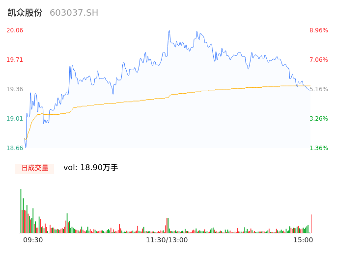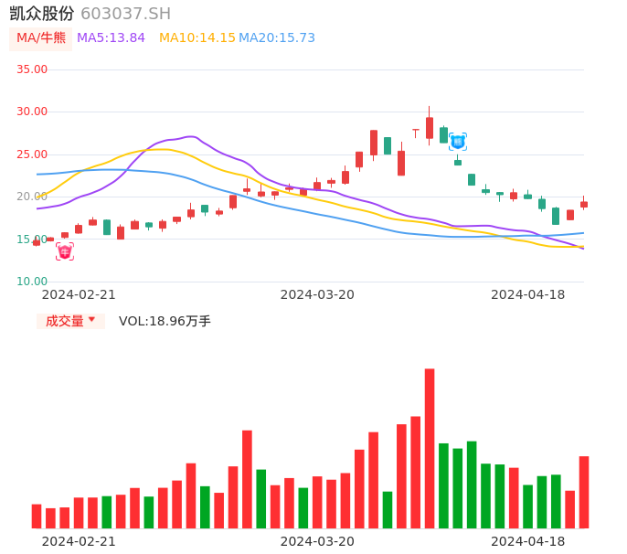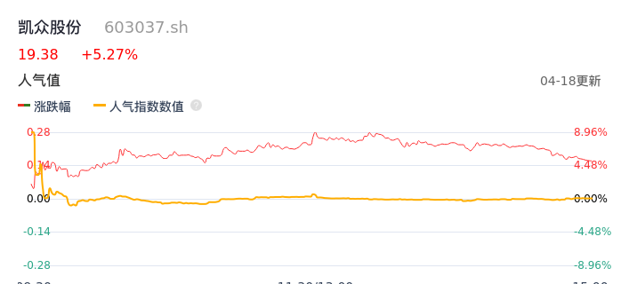 04月18日,凯众股份收报19.38,股价涨幅5.27%,成交金额3.68亿元,换手率13.96%。