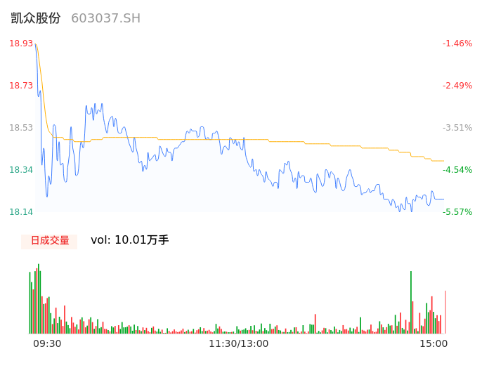 04月22日,凯众股份收报18.20,股价涨幅-5.26%,成交金额1.84亿元,换手率7.37%。