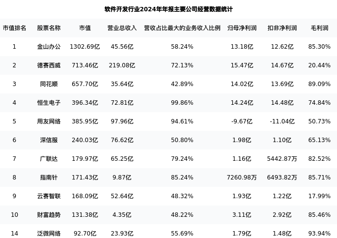泛微网络最新报告期数据为年报,下表汇总了软件开发行业内市值靠前的公司年报主要经营数据