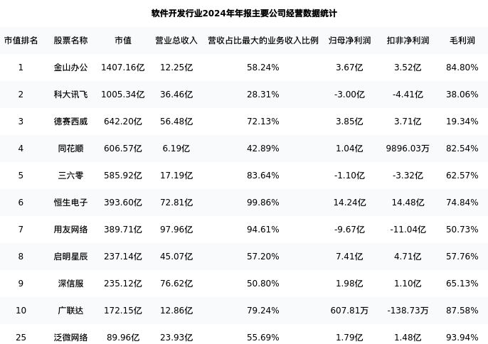泛微网络最新报告期数据为年报,下表汇总了软件开发行业内市值靠前的公司年报主要经营数据
