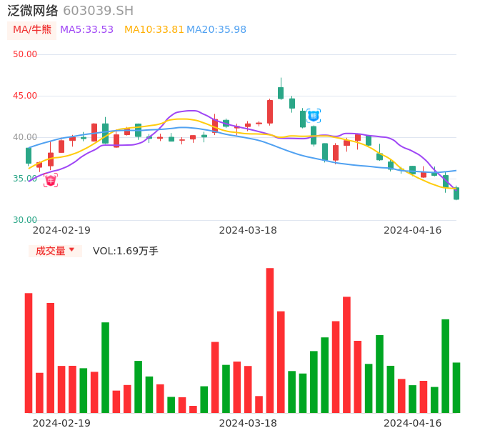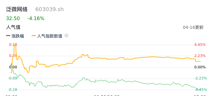 04月16日,泛微网络收报32.50,股价涨幅-4.16%,成交金额5558.23万元,换手率0.65%。
