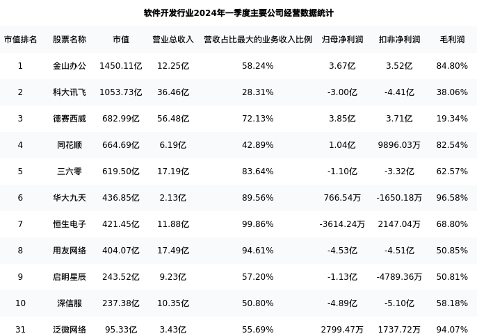 泛微网络最新报告期数据为一季度,下表汇总了软件开发行业内市值靠前的公司一季度主要经营数据