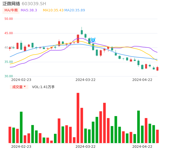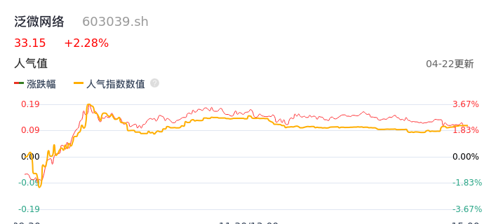 04月22日,泛微网络收报33.15,股价涨幅2.28%,成交金额4653.71万元,换手率0.54%。