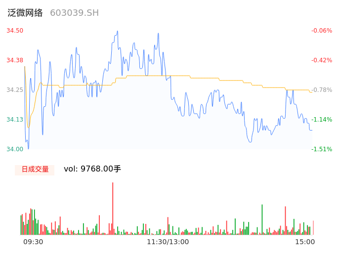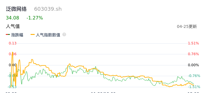 04月25日,泛微网络收报34.08,股价涨幅-1.27%,成交金额3344.80万元,换手率0.37%。