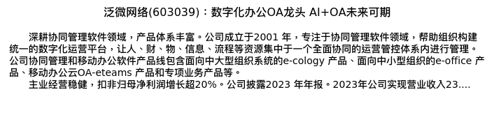 值得注意的是:2024年04月海通证券的杨林/杨蒙分析师,首次发布关于泛微网络的研究报告,标题为:泛微网络(603039):数字化办公OA龙头 AI+OA未来可期。