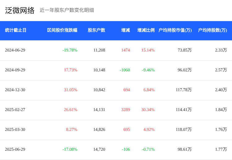 截至2025年6月30日,泛微网络(603039)的股东户数为1.47万户,相比上一季度减少了710户,环比下降0.71%。户均持股数量环比增加了0.72%,户均持股市值为98.61万元,环比下降16.48%。这表明尽管股东数减少,但剩余股东的持股比例有所增加,显示出集中度的提升。