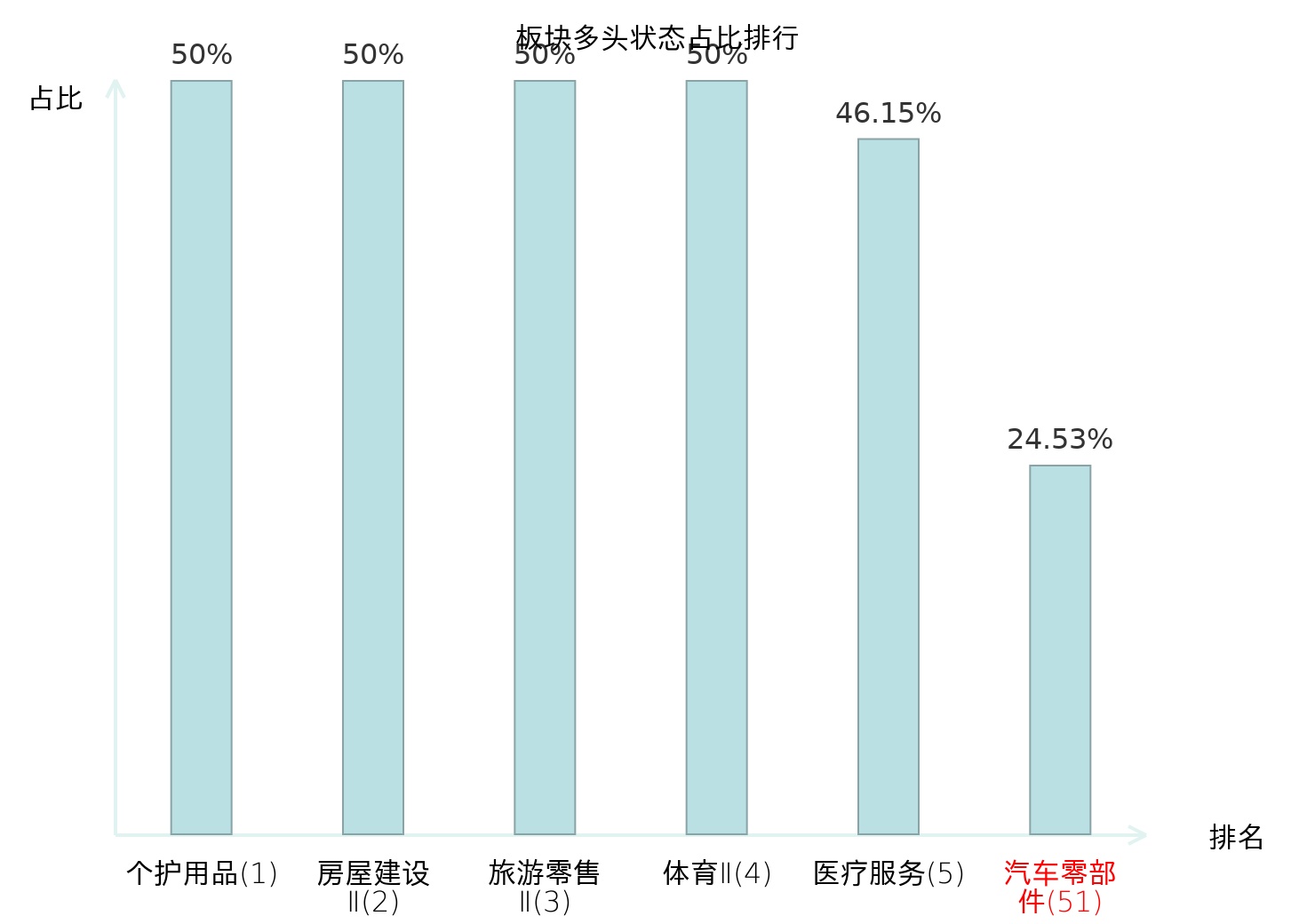 全市场所有行业板块中主力多头状态占比排名中,个护用品板块位居第一。影视院线板块名次提升最快,较昨日上升56位。