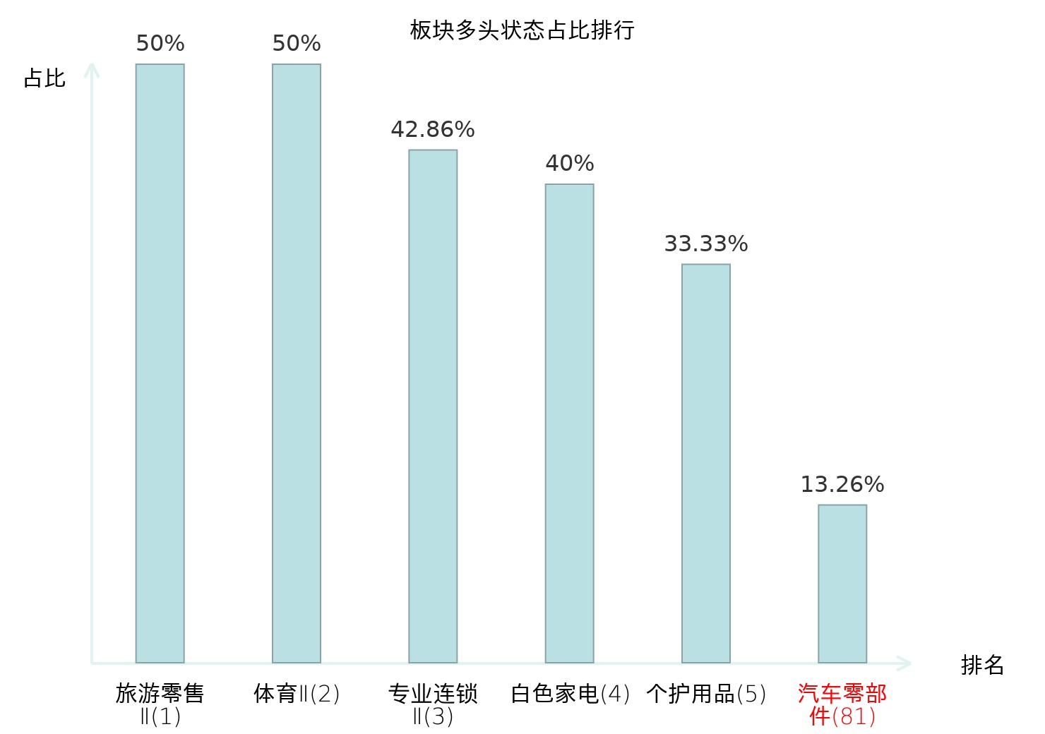 全市场所有行业板块中主力多头状态占比排名中,旅游零售Ⅱ板块位居第一。化学原料板块名次提升最快,较昨日上升35位。
