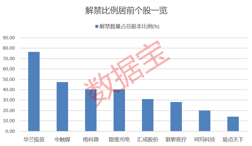 从解禁比例来看,华兰疫苗的解禁比例居首,达76.37%;中触媒格科微路维光电汇成股份等解禁比例也居前。