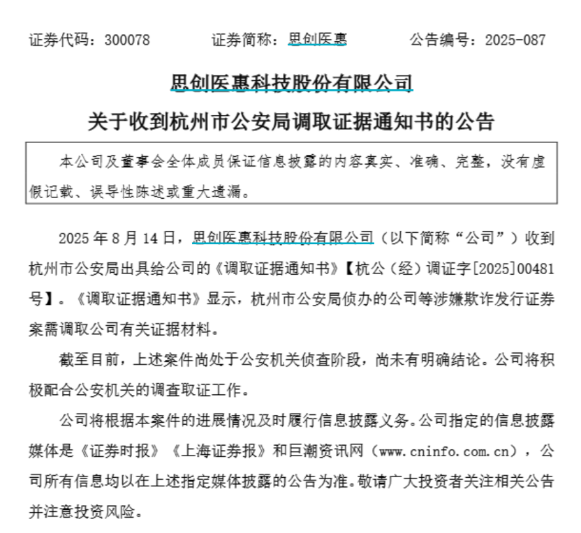 昨日(8月15日)晚间,思创医惠(300078)公告称,公司于2025年8月14日收到杭州市公安局出具的《调取证据通知书》。该通知书显示,杭州市公安局在侦办的公司等涉嫌欺诈发行证券案中,需调取公司有关证据材料。
