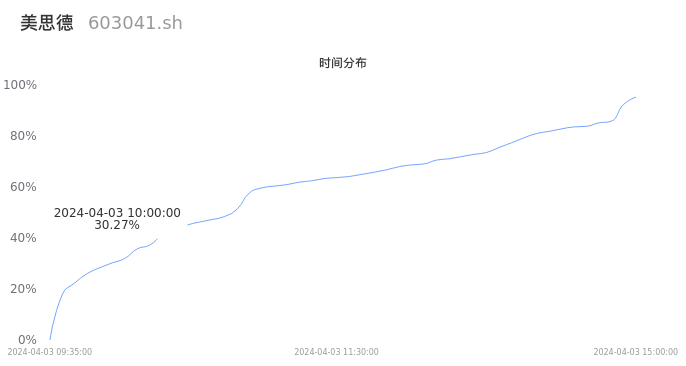 603041美思德2024年04月03日成交1.79万手,成交金额2071.76万元,相较昨日缩量1.45万手,换手率0.98%,成交清淡。