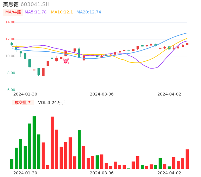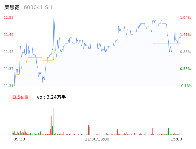 04月02日,美思德收报11.52,股价涨幅1.68%,成交金额3717.05万元,换手率1.77%。