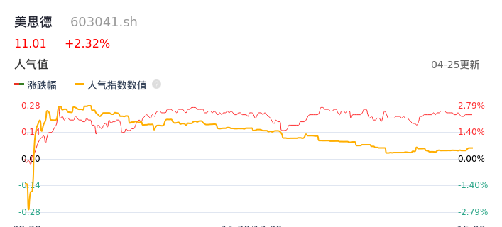 04月25日,美思德收报11.01,股价涨幅2.32%,成交金额1703.58万元,换手率0.85%。